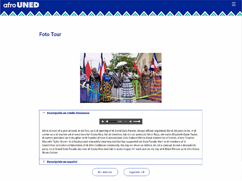Este sitio web ofrece un espacio de memoria, identidad cultural y resistencia que celebra la identidad afrodescendiente en Costa Rica, especialmente en la provincia de Limón. A través de fotografías, sonidos, palabras, texturas y otros recursos, reconoce los aportes, las luchas y las expresiones culturales de este pueblo, e invita a aprender, agradecer y mantener viva su herencia y aporte cultural al país.